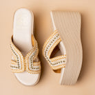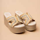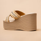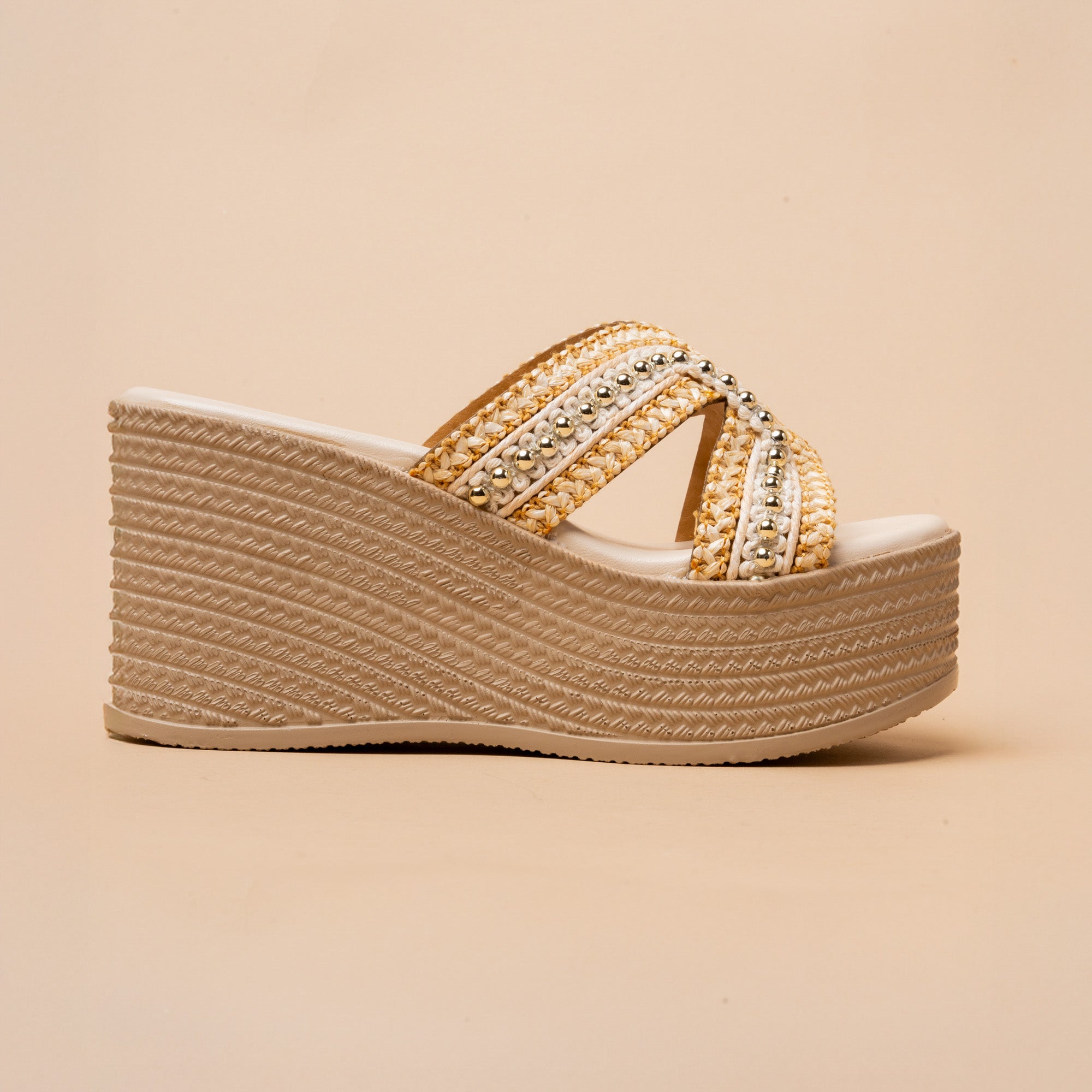 Step into easy elegance with the Braided Pearl Wedges, designed for those who love height with comfort. Featuring intricately braided straps adorned with pearl accents, this pair adds a soft feminine charm to every look. The lightweight platform wedge provides extra lift without the strain, while the neutral base ensures versatility across ethnic, festive, and resort outfits. Perfect for adding understated glamour to your everyday wear.