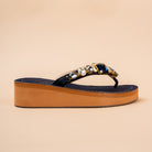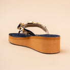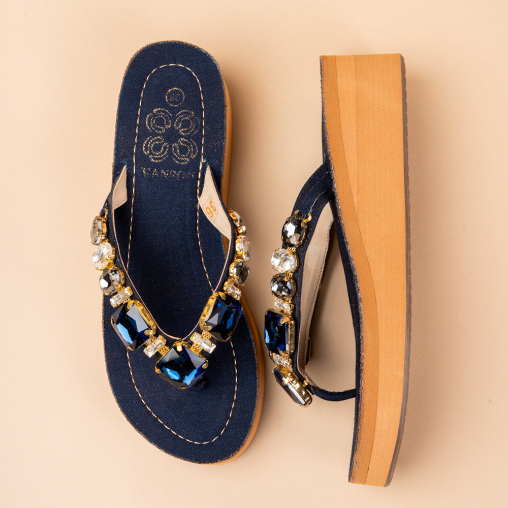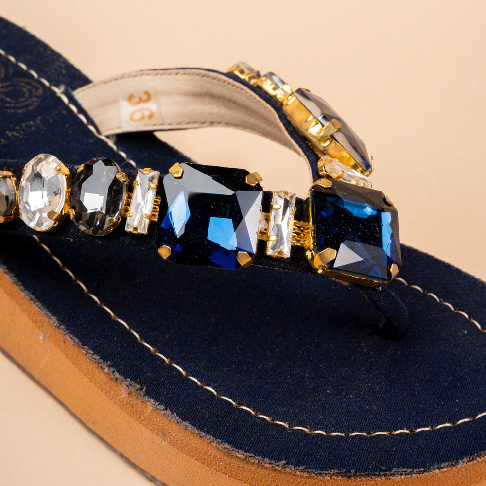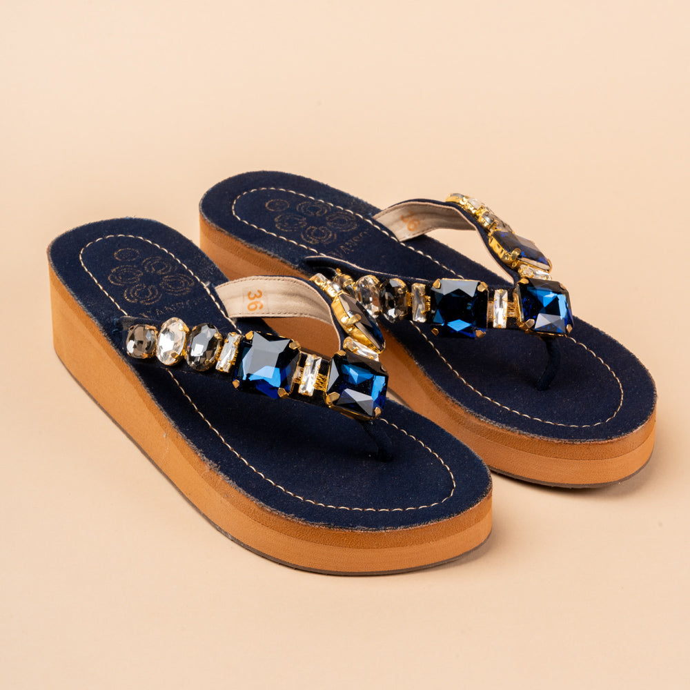 The Persian Chill Platforms in deep blue denim and brown antique gold, feature large rock and crystals on a comfy rubber platform base. High quality crystals handcrafted and stitched on rubber sole with V shapes easy to slip on silhouette. Perfect for daily as well as festive be it weddings, cocktail nights, or festive evenings where you want to shine. Wear them with sarees, palazzos, jeans or gowns for sparkle without heels.