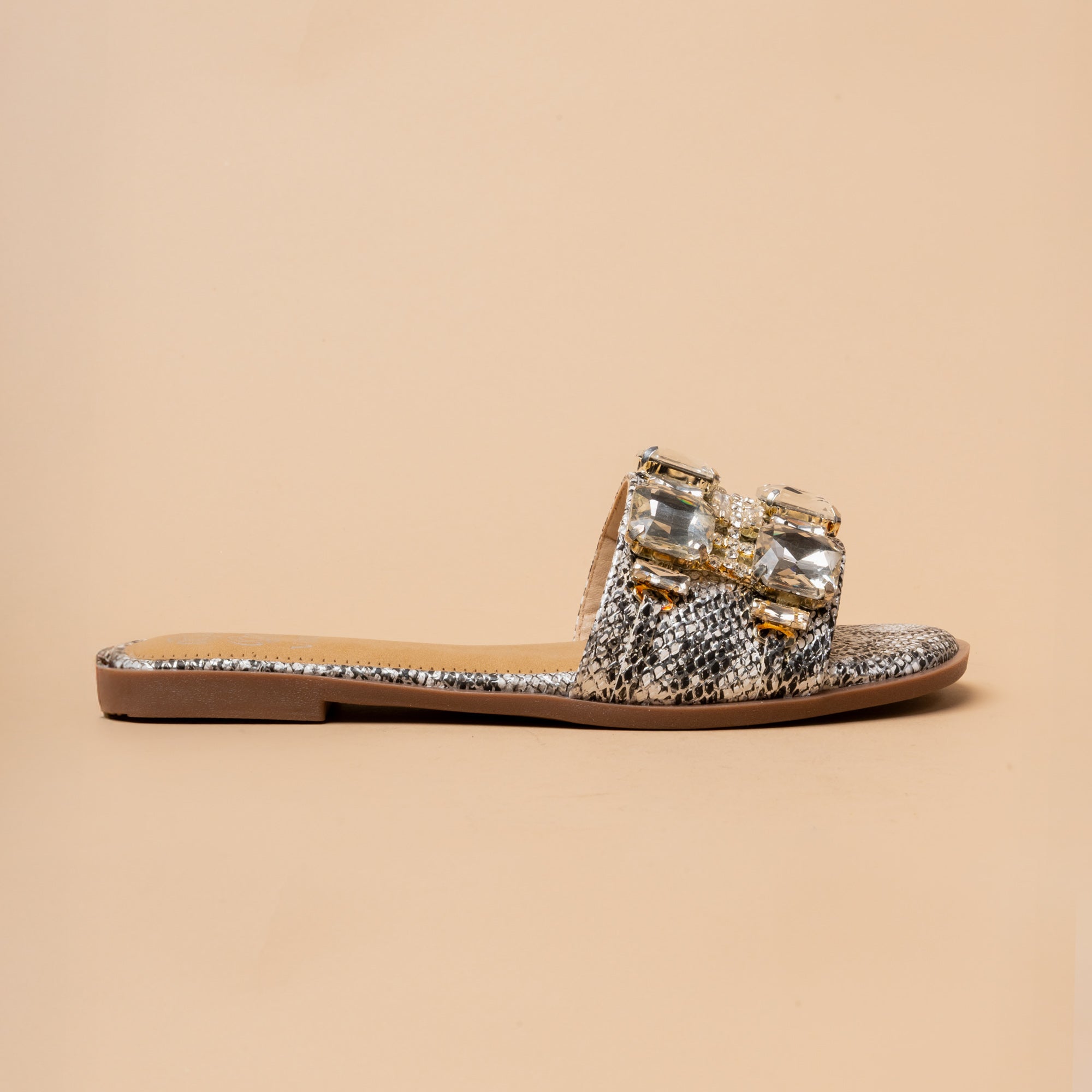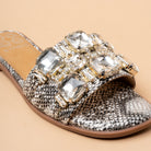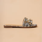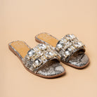 The Septum Stones Flats bring glamour to every step with oversized gemstone detailing on a comfy slip-on textured metallic base. Available in gold and silver, these flats are perfect for weddings, festive evenings, or family celebrations. A chic alternative to heels, they deliver sparkle with all-day ease.
