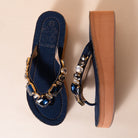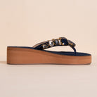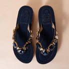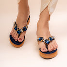 The Persian Chill Platforms in deep blue denim and brown antique gold, feature large rock and crystals on a comfy rubber platform base. High quality crystals handcrafted and stitched on rubber sole with V shapes easy to slip on silhouette. Perfect for daily as well as festive be it weddings, cocktail nights, or festive evenings where you want to shine. Wear them with sarees, palazzos, jeans or gowns for sparkle without heels.