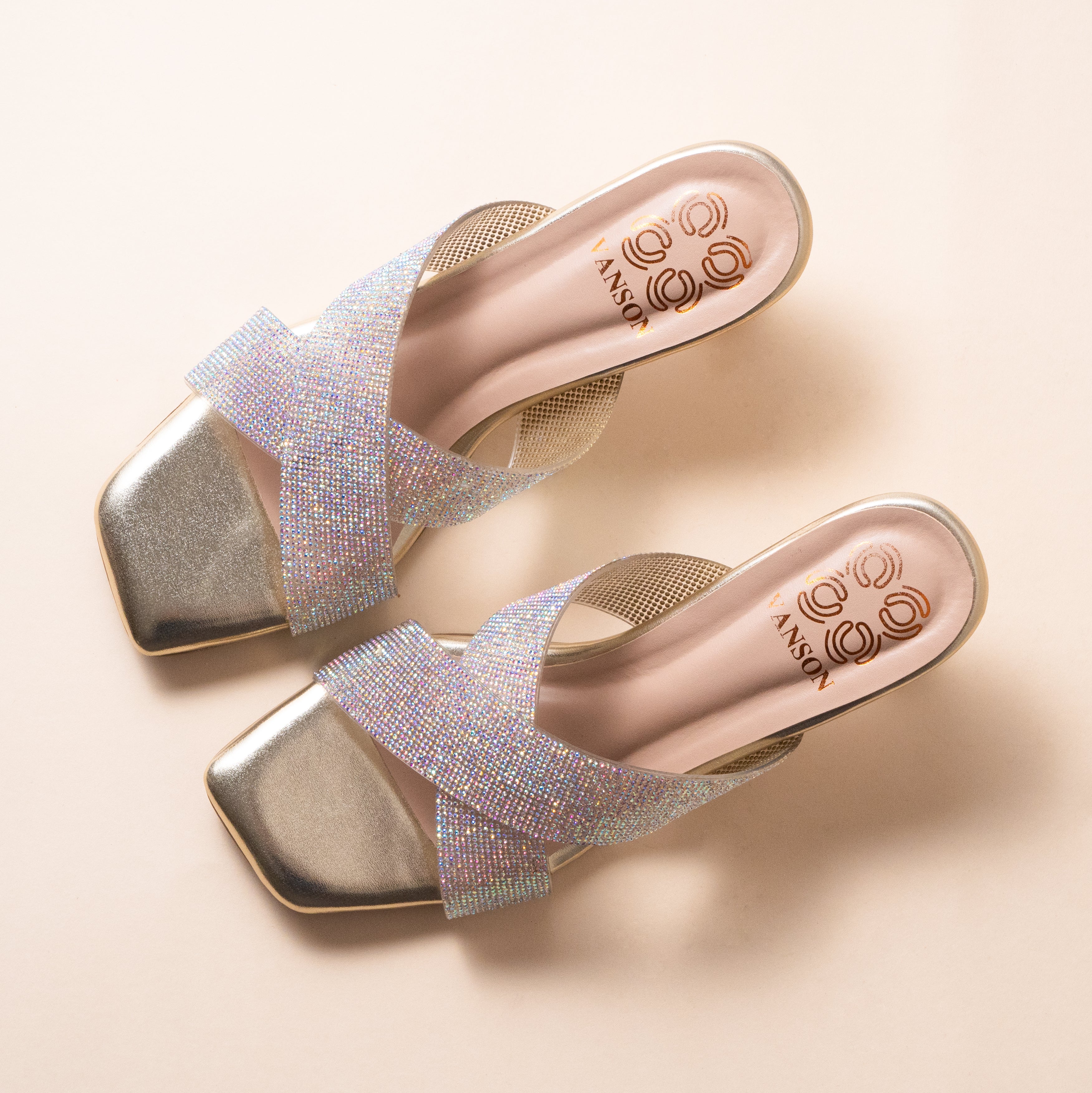 The Annabelle Heels are designed with elegance in mind—featuring crystal-studded cross straps and a golden goblet or bell shaped heel. Perfect for weddings, parties, or festive celebrations, these heels are equal parts stylish and comfortable. Their unique heel design makes them a standout choice for special occasions.