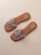Set on a soft, cushioned tan footbed with refined edge detailing, the design balances comfort with statement style. The open slip-on construction makes it perfect for both casual daywear and elevated festive looks—whether paired with summer dresses, ethnic kurtas, or resort wear.Lightweight, breathable, and visually striking, the Aurora Flutterby Sandals are designed for women who love subtle glamour without compromising on ease.