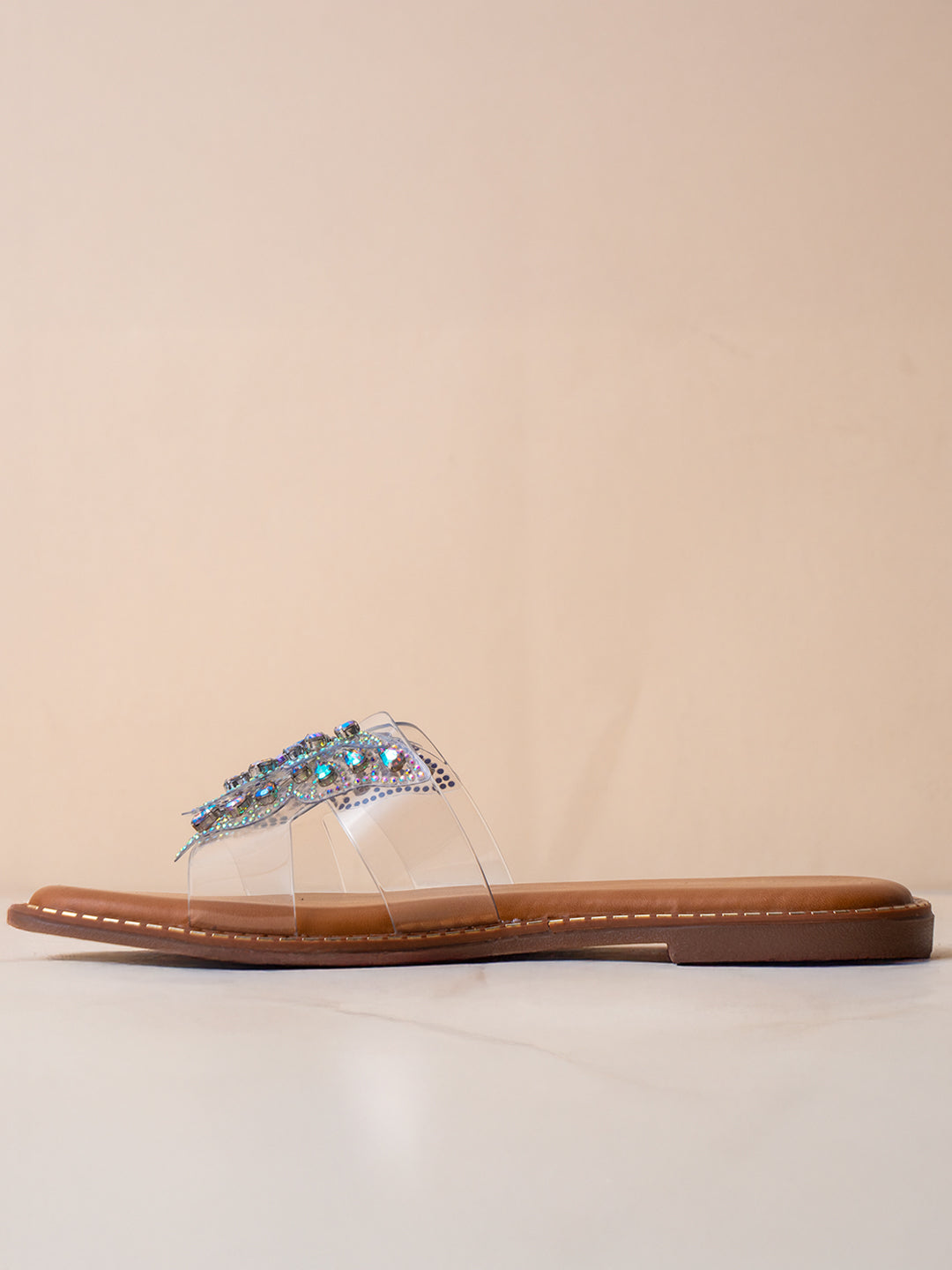 Delicate butterfly-inspired slip-on featuring iridescent crystal wings on a transparent strap, designed for effortless elegance and all-day comfort.The Aurora Wing Slip-On Sandals are a celebration of light, movement, and feminine grace. Crafted with a minimal silhouette, these sandals feature a transparent upper adorned with iridescent crystal butterfly wings that shimmer beautifully with every step.