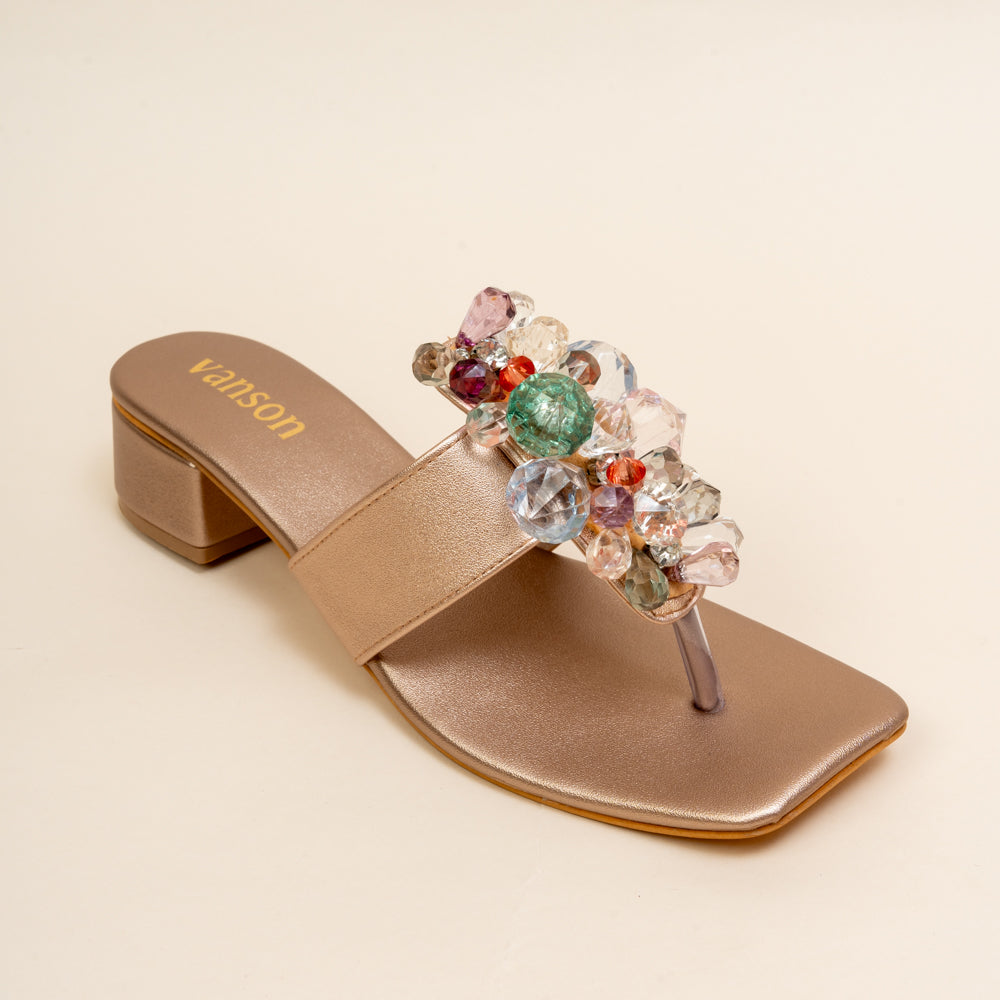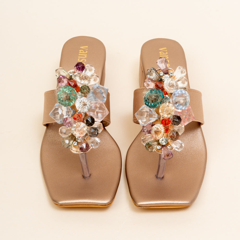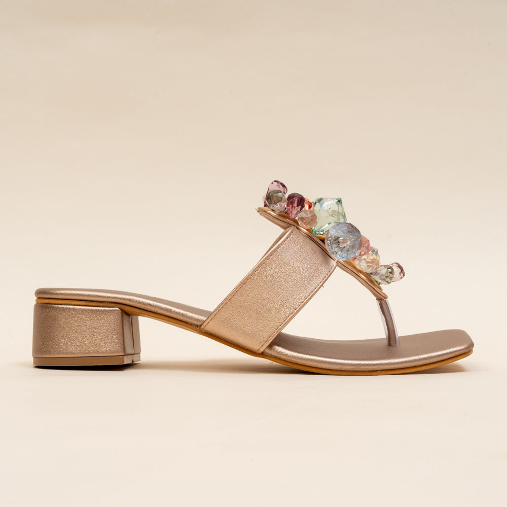 The Crystal Pop heels are where elegance meets play. Designed in a soft champagne-gold tone, these slip-ons are crowned with iridescent crystal clusters that catch every flicker of light. Each crystal is hand-set to create a vibrant burst of colour, making the pair both glamorous and effortlessly wearable.