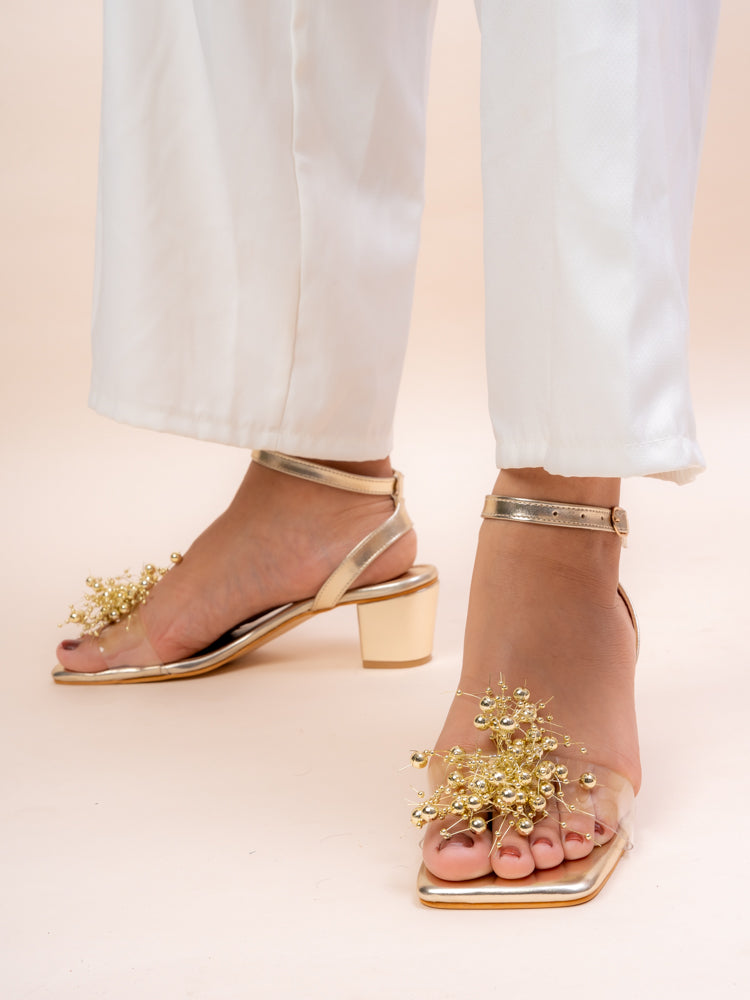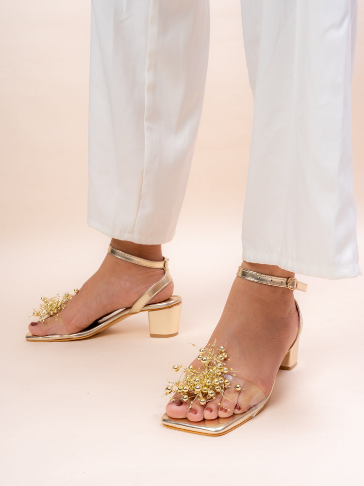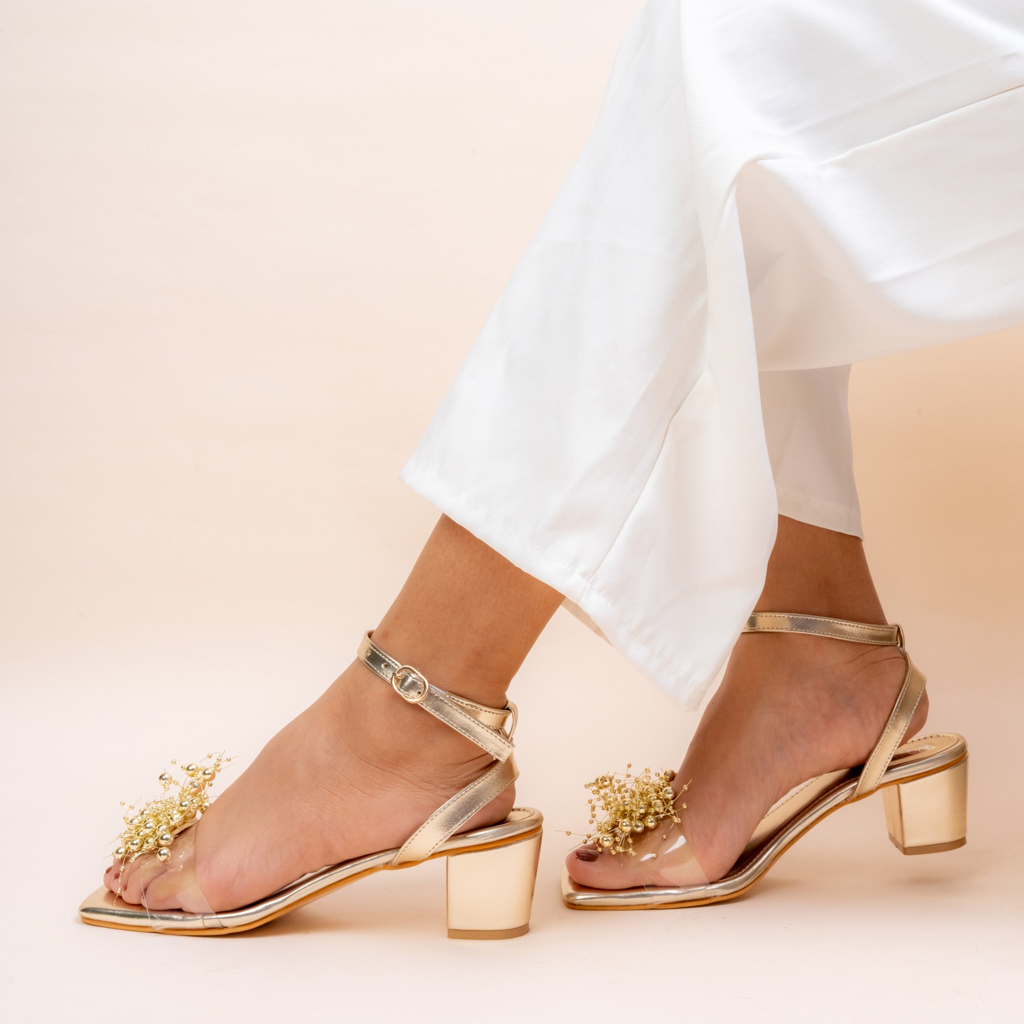 Make every step shine with Vanson’s Gold Coral Heels. Crafted in metallic gold, this heel features a radiant starburst of gold spheres for a dramatic, red-carpet-worthy effect. The sleek ankle strap and square toe design combine elegance with bold energy, ideal for evening glam or festive occasions.