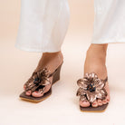 The Lily Bronze Wedge heels bring a touch of handcrafted artistry to your everyday and festive looks. Designed with a 3D floral accent in luxe metallic tones, these wedges offer both sophistication and all-day comfort. The lightweight PU wedge base provides elevation without strain, while the padded sole ensures a cushioned step with every wear.