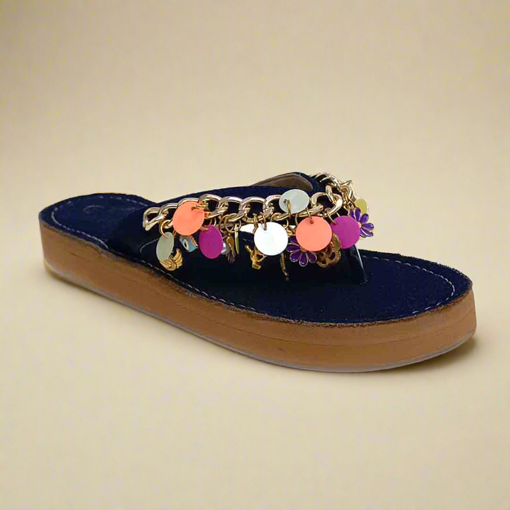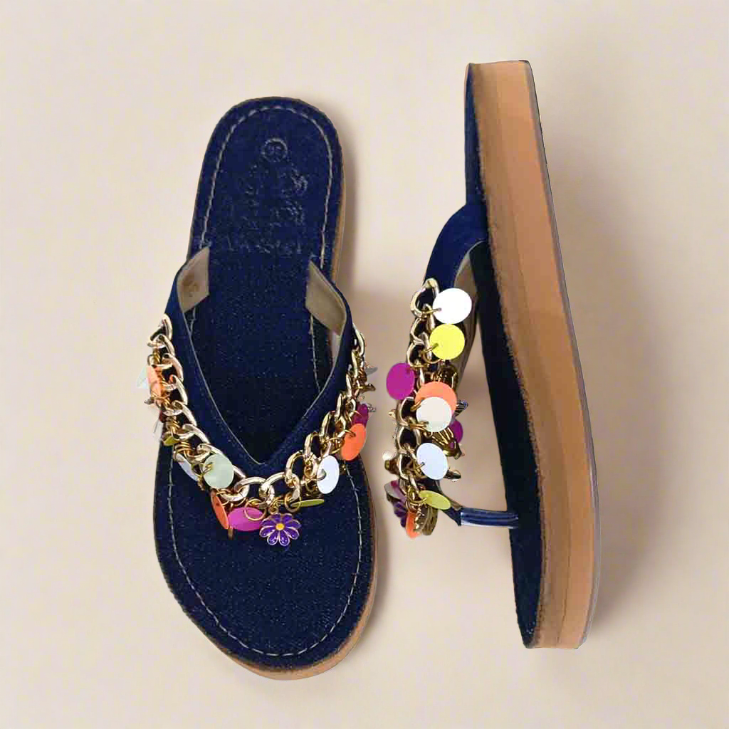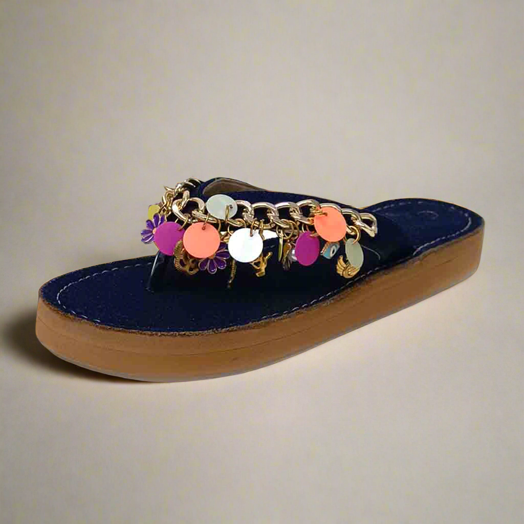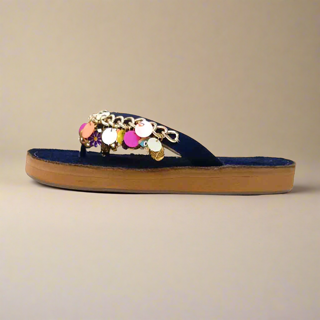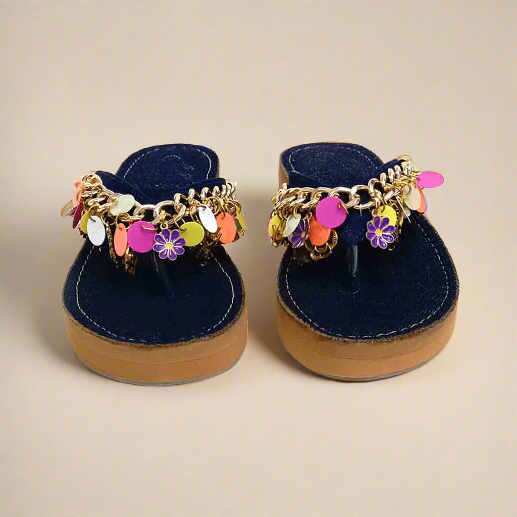 The Lucky Charm Slippers in denim and tan brown feature a gold chain with playful charms. Extra comfortable low height platforms with a V shaped strap full of cuteness. Fun and comfortable, they’re ideal for festive occasions, vacations, or casual outings. Pair them with ethnic or casual wear to add a quirky twist to your look.