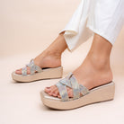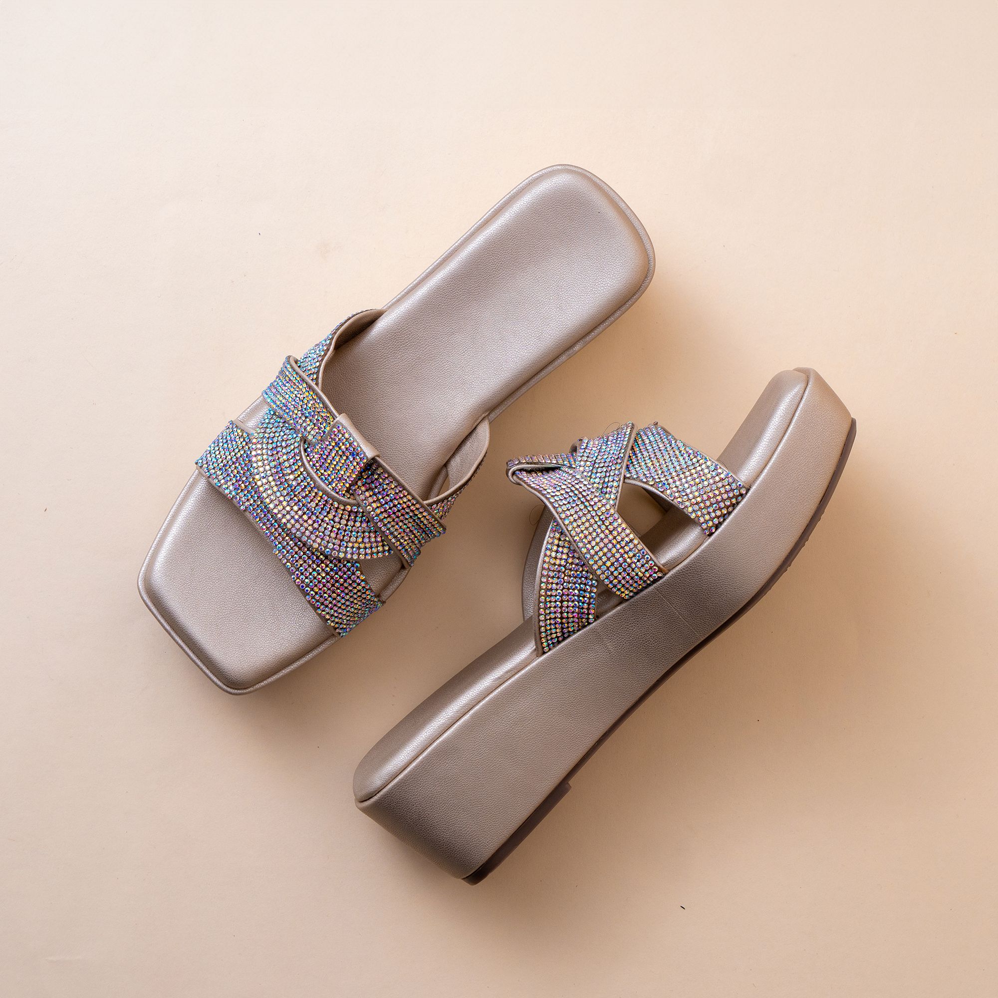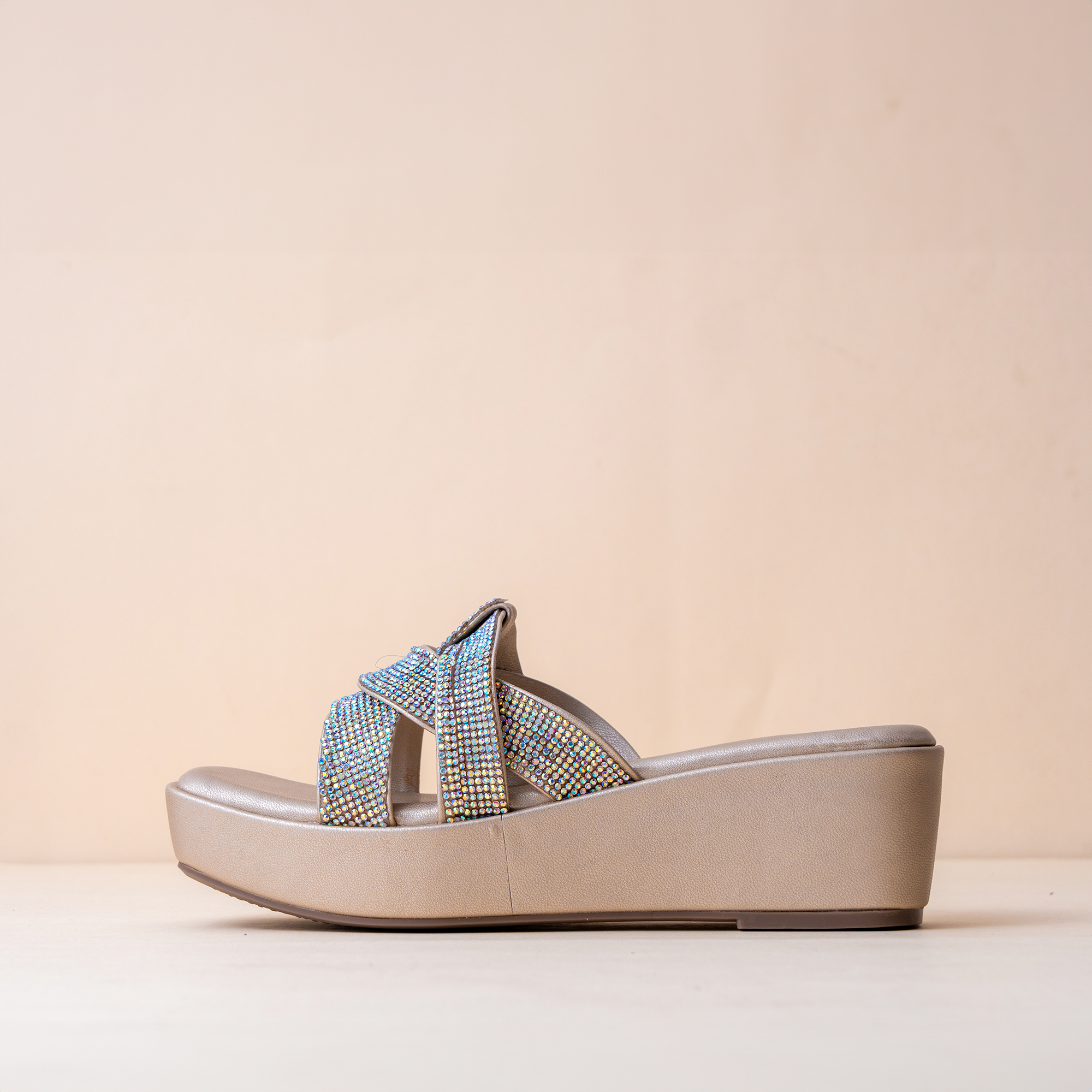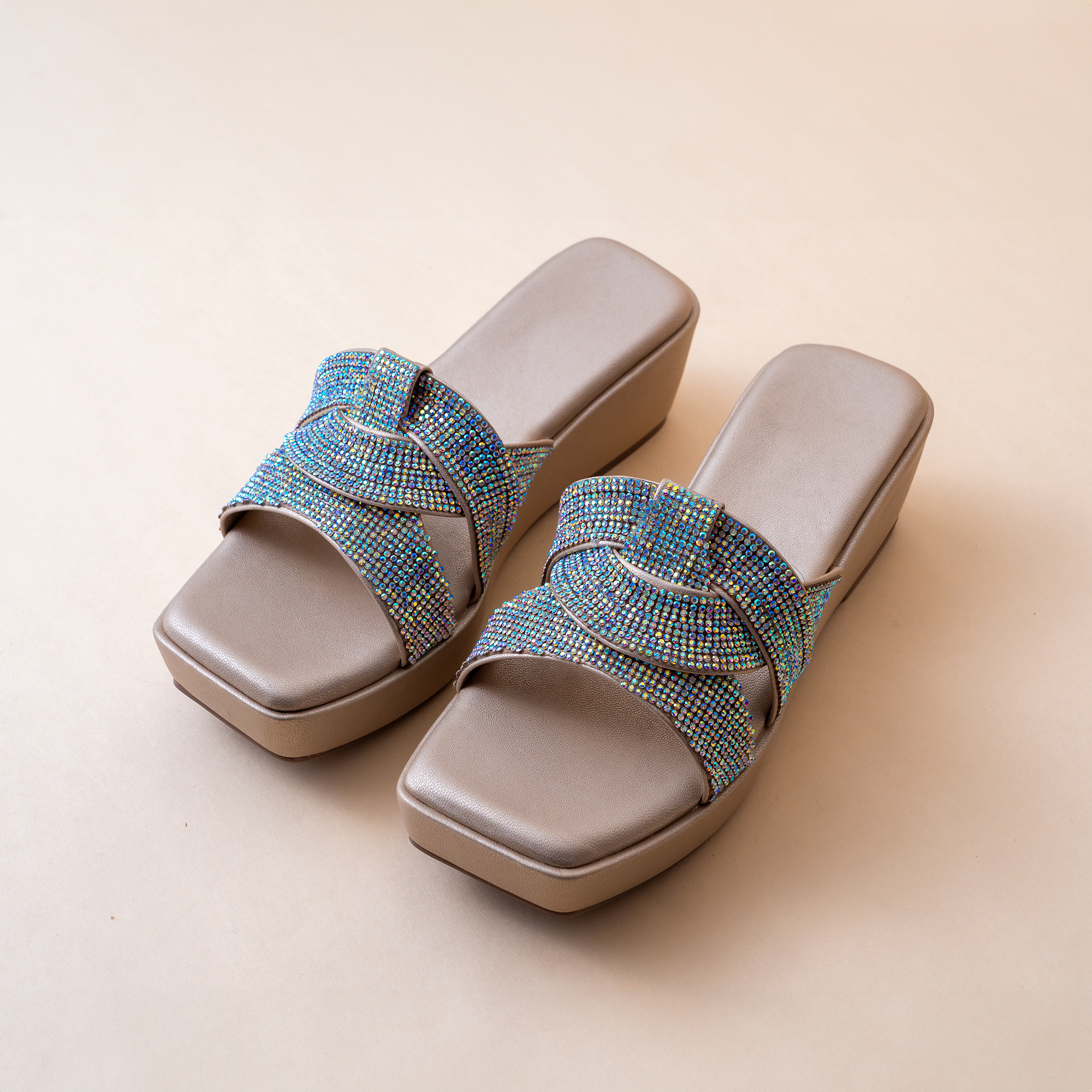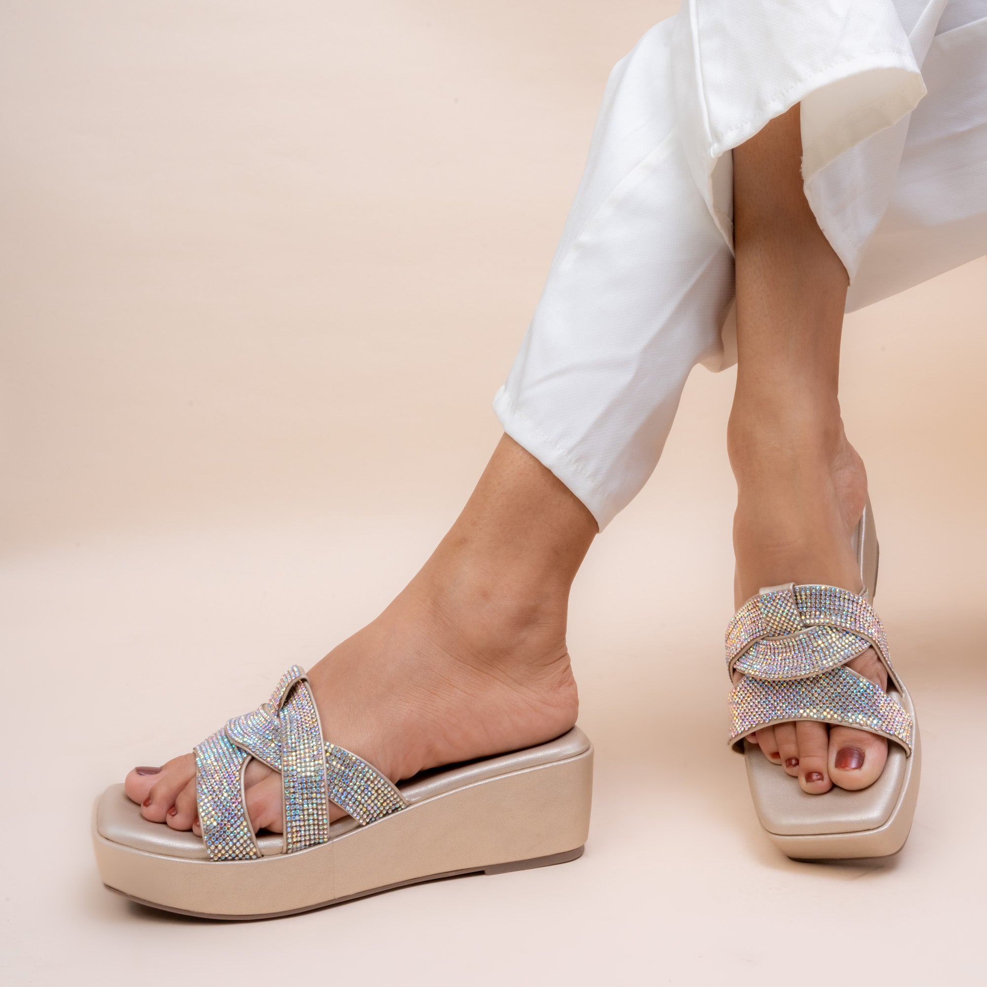 Moon Wave wedge heels are bold and stylish, designed with rhinestone-covered straps on a black and beige base. With their modern square-toe silhouette and slip-on ease, they’re perfect for ethnic and modern outfits. Comfortable yet dazzling, they add an instant touch of glam to any outfit. Crafted finely by hand, it is designed for a full day usage with appropriate height and style.