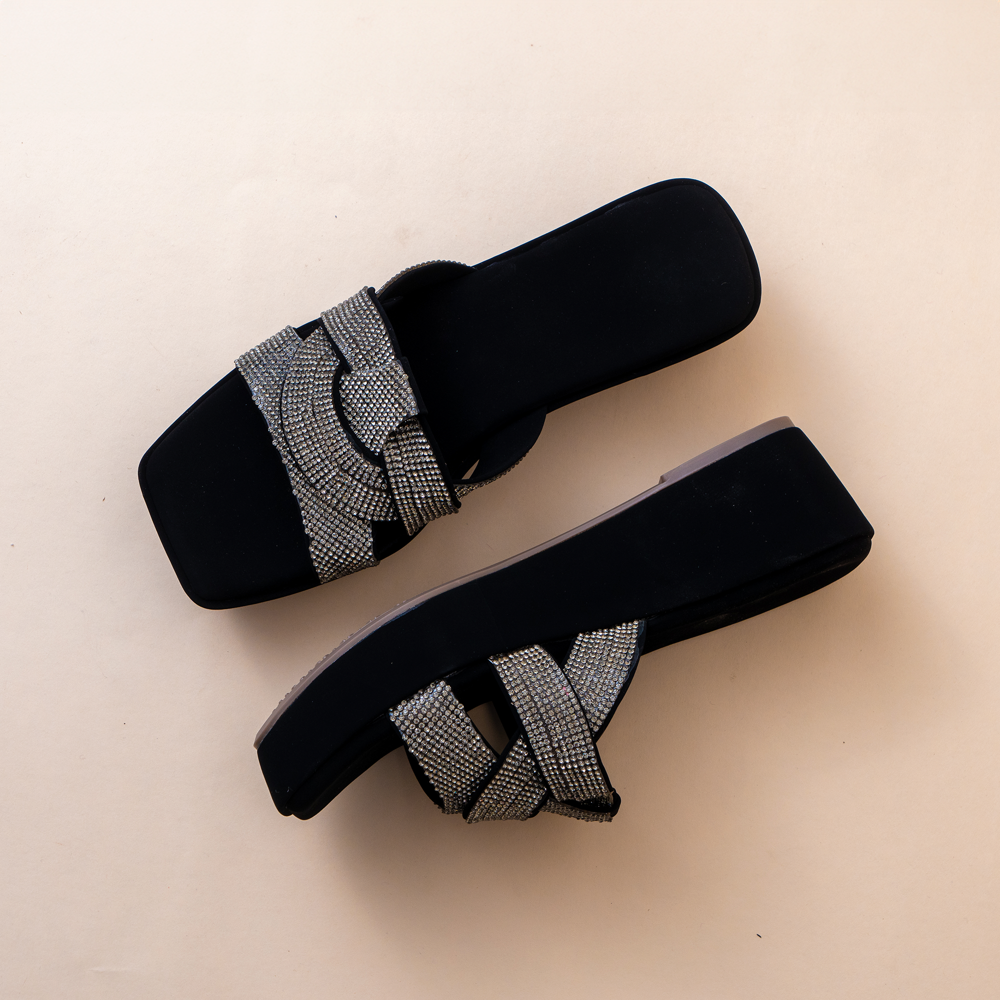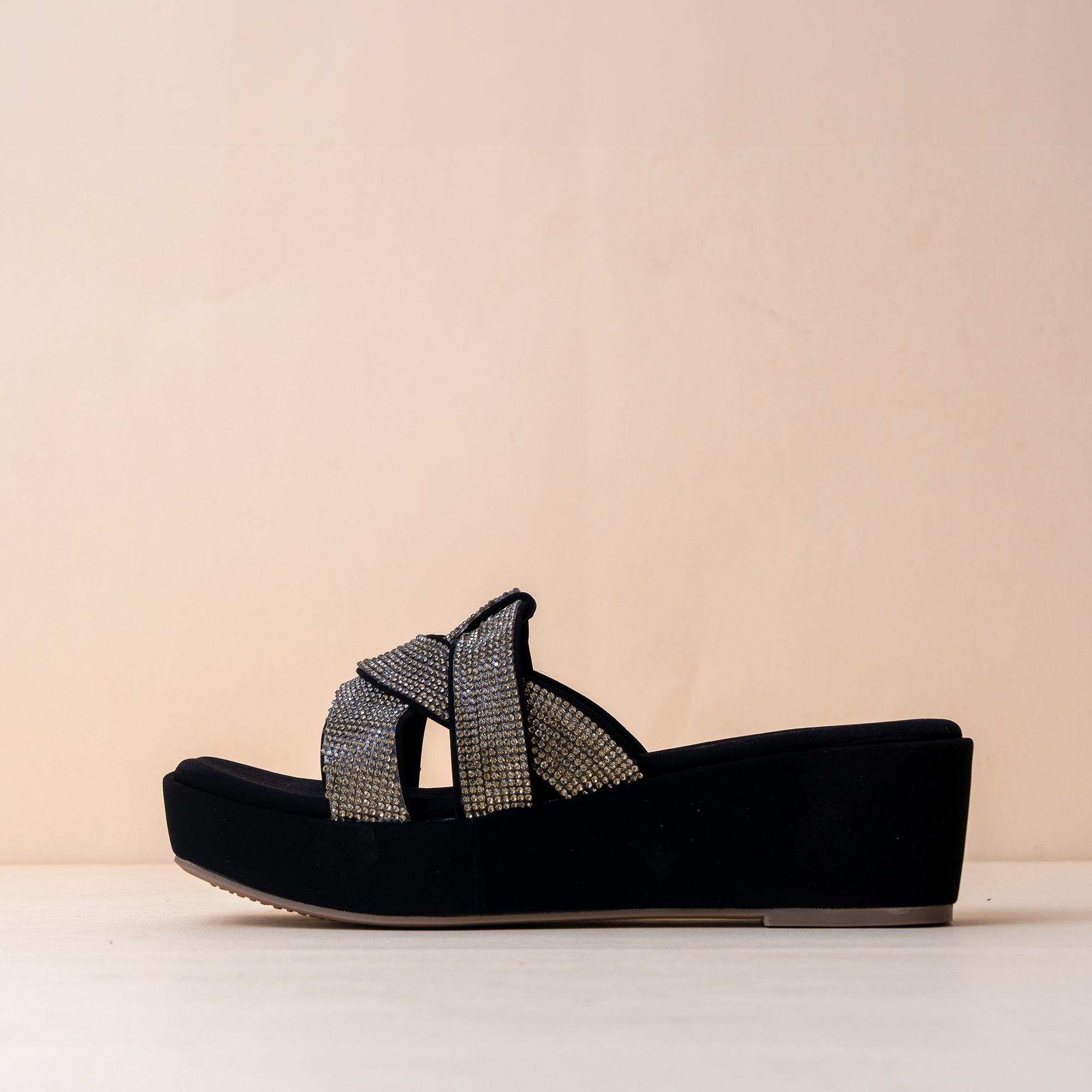 Moon Wave wedge heels are bold and stylish, designed with rhinestone-covered straps on a black and beige base. With their modern square-toe silhouette and slip-on ease, they’re perfect for ethnic and modern outfits. Comfortable yet dazzling, they add an instant touch of glam to any outfit. Crafted finely by hand, it is designed for a full day usage with appropriate height and style