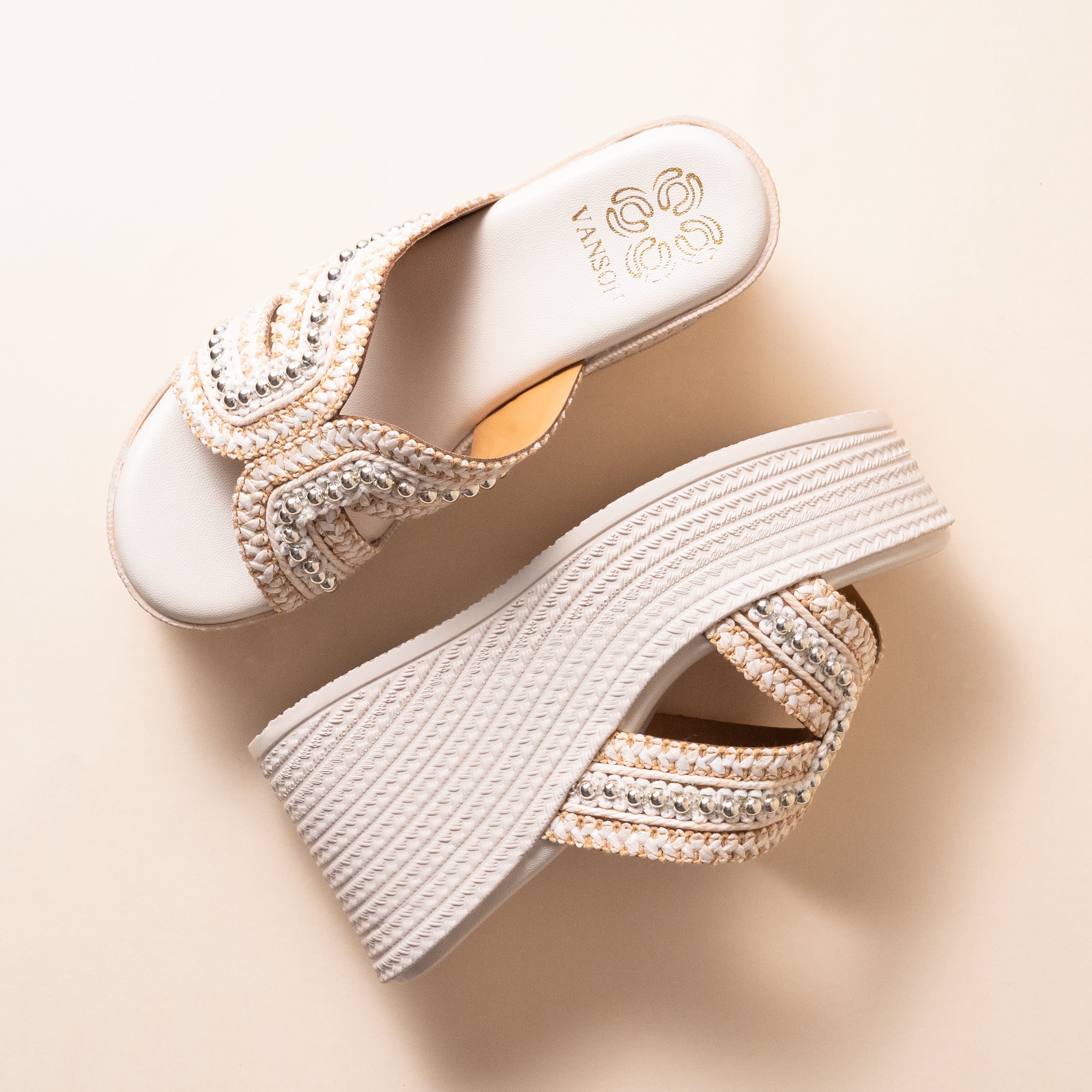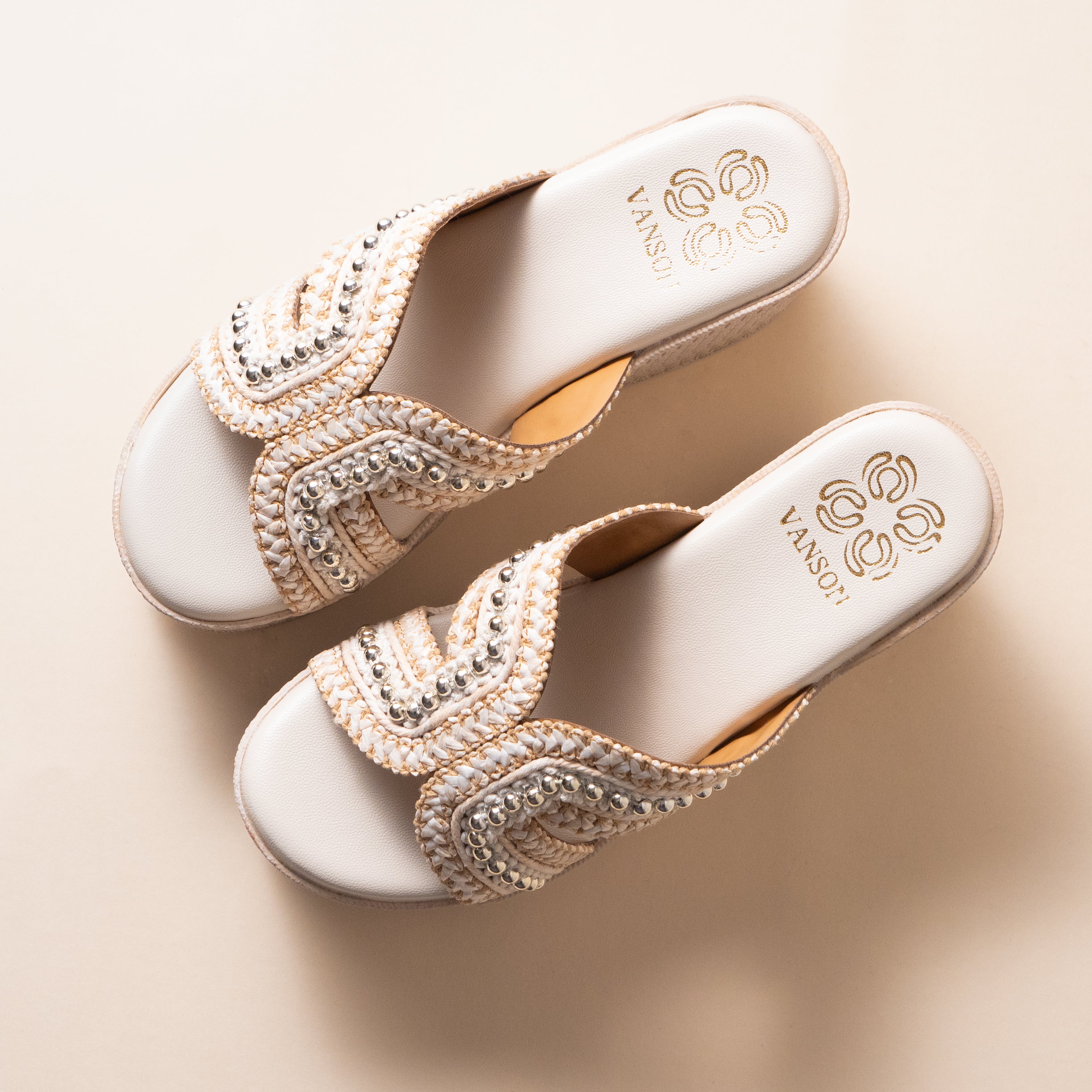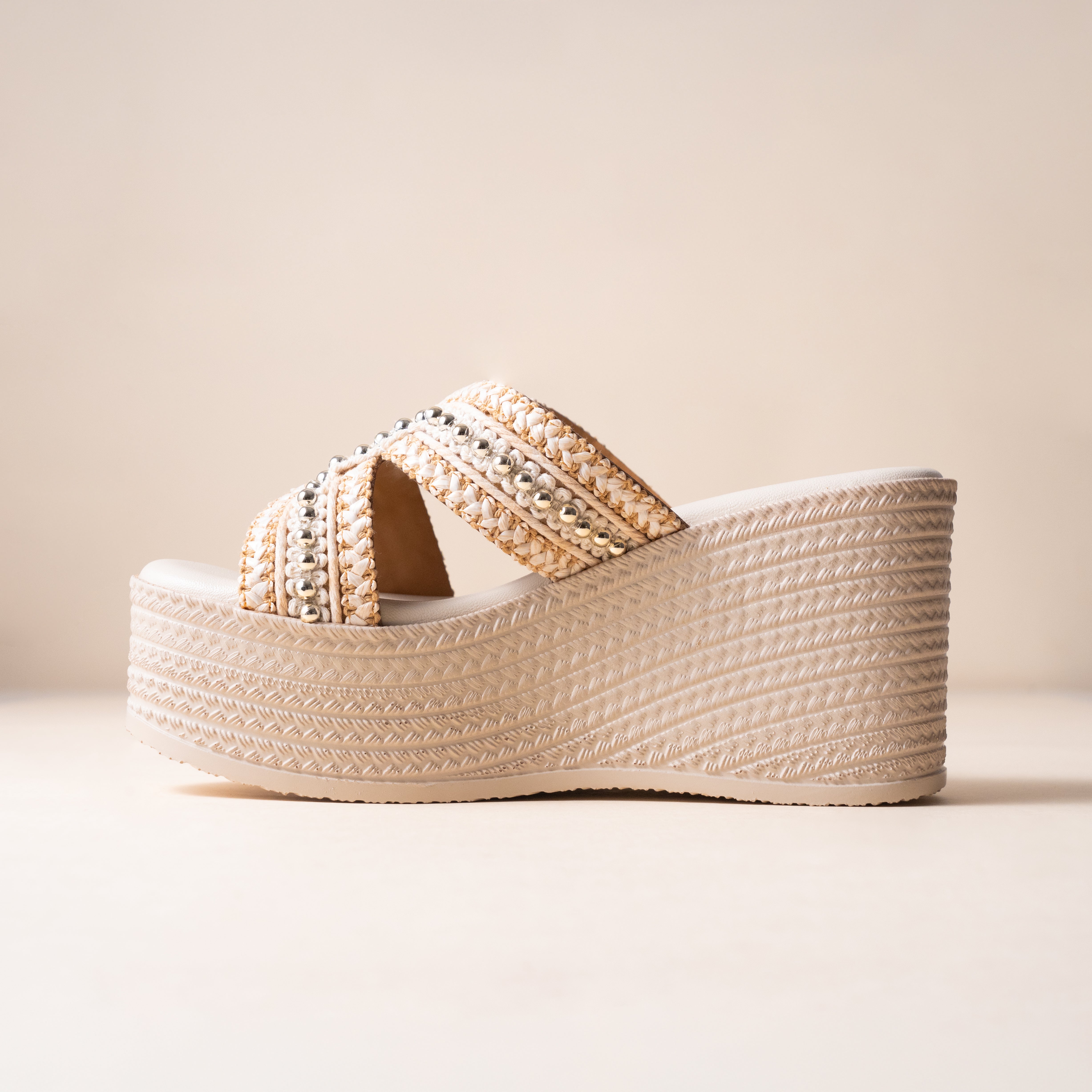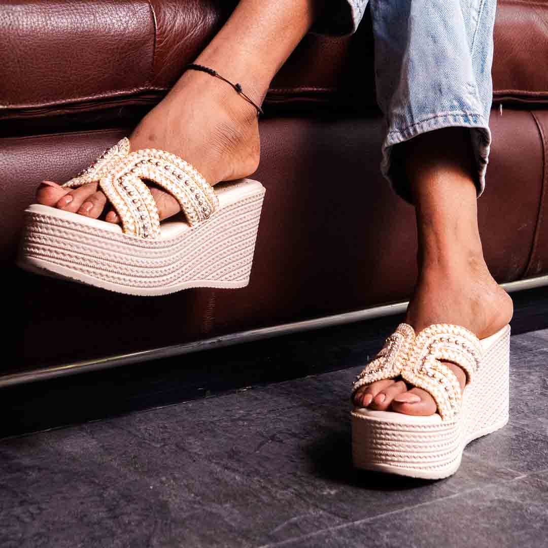 Step into easy elegance with the Braided Pearl Wedges, designed for those who love height with comfort. Featuring intricately braided straps adorned with pearl accents, this pair adds a soft feminine charm to every look. The lightweight platform wedge provides extra lift without the strain, while the neutral base ensures versatility across ethnic, festive, and resort outfits. Perfect for adding understated glamour to your everyday wear.