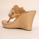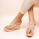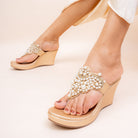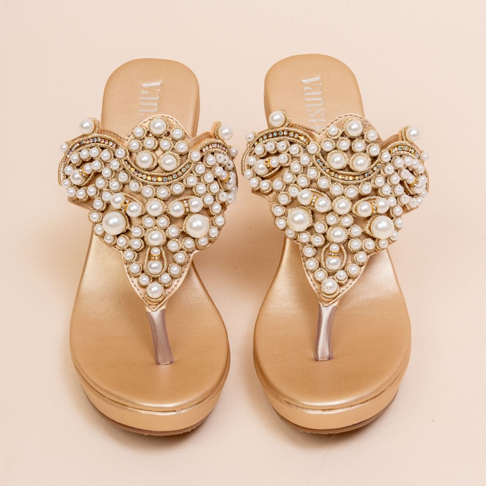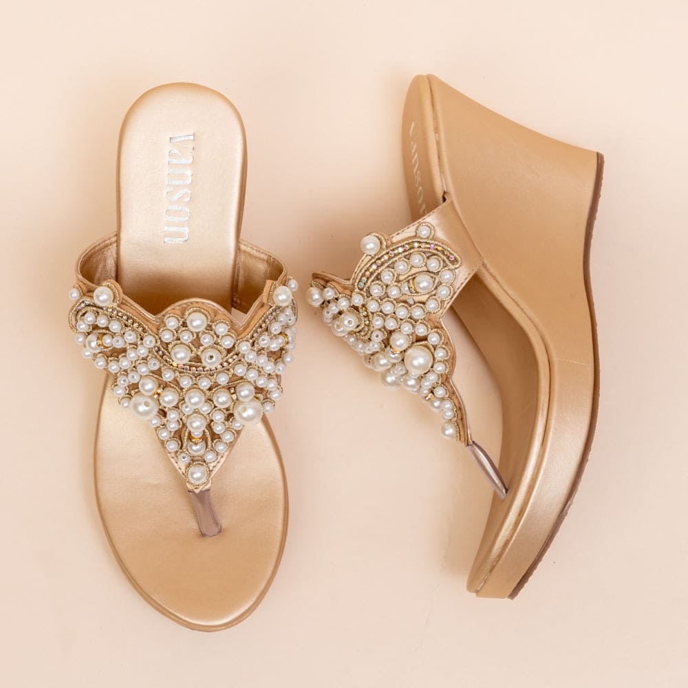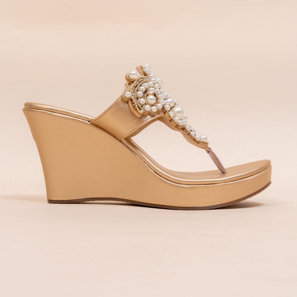 Step into timeless elegance with these cream pearl-embellished wedge sandals. The hand-crafted upper features clusters of lustrous pearls and fine bead embroidery that add a regal charm to every outfit. Designed and crafted with hand and machine on a stable wedge heel, these sandals blend comfort with sophistication — ideal for weddings, festive celebrations, or evening soirées. Lightweight yet luxurious, they elevate both traditional and modern looks effortlessly.