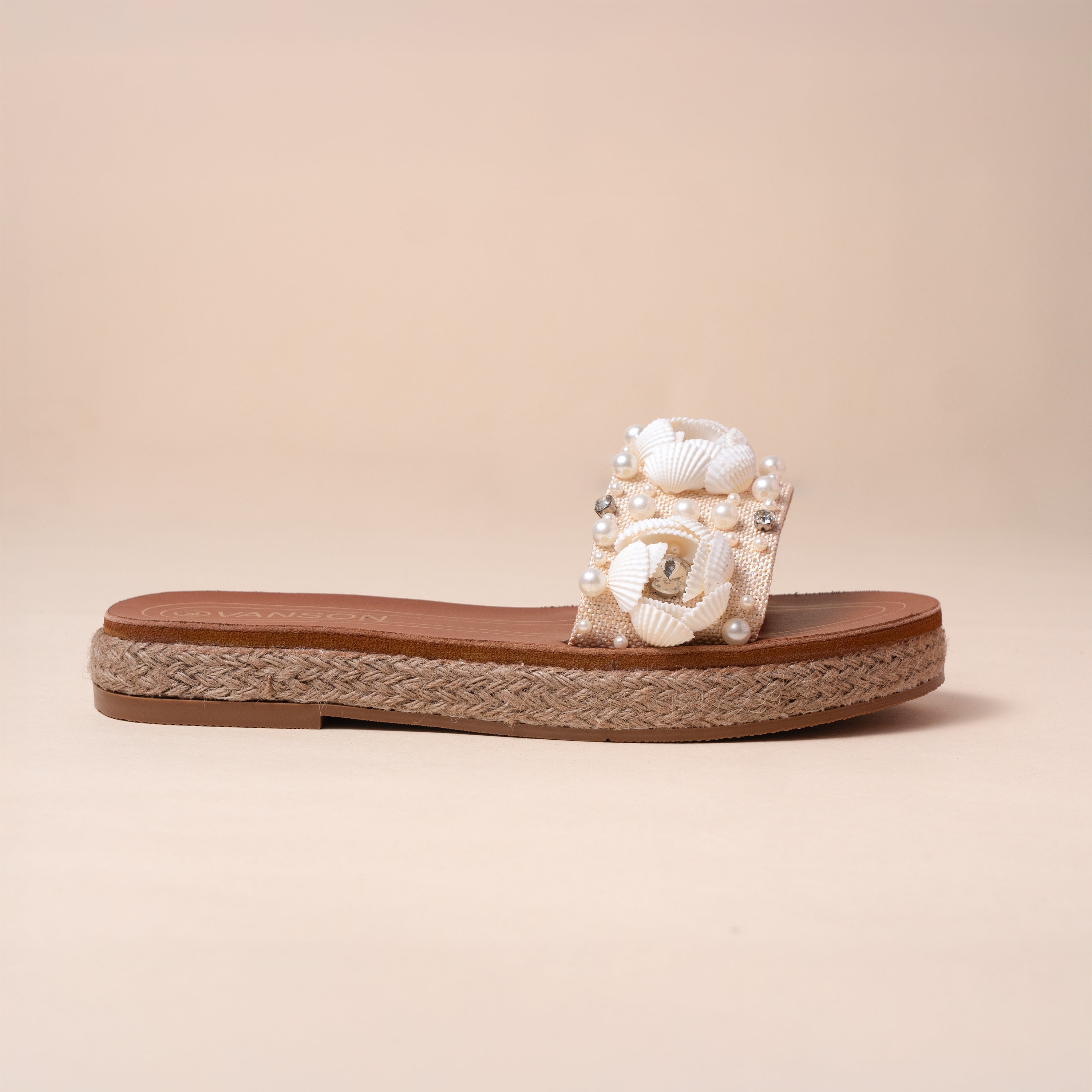 The Shelly Pearl Sliders combine casual denim with handcrafted floral detailing, accented by pearls and shells. Perfect for brunches, vacations, or everyday wear, they add a fresh and playful vibe to any outfit. Comfortable and unique, they’re a standout piece for women who love statement flats. With the espadrille detailing of the sole, and the gold inlay print, the pair is one of a kind! Crafted and artsy !