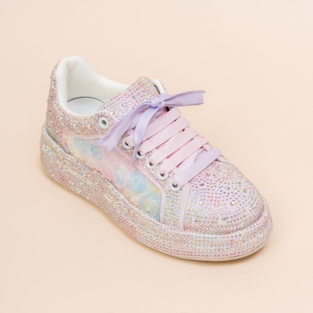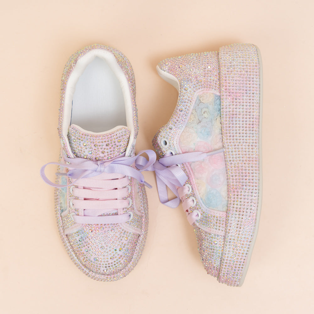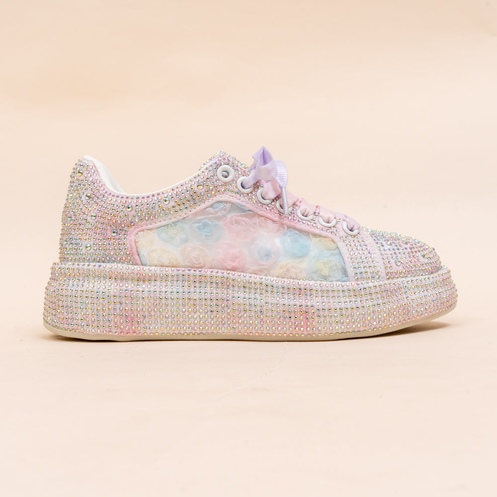 The Sky Burst Roses sneakers are a dreamy blend of romance and modern bling. Embellished with pastel rhinestones and delicate 3D rose mesh panels, they’re designed for those who love playful femininity with a luxe edge. Finished with soft pink laces and a cushioned platform sole for effortless comfort.