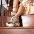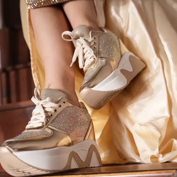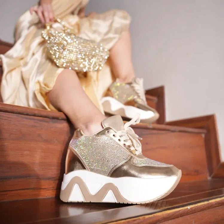 The Twinkle Kick Sneakers shine in gold and silver with rhinestone accents. With high platform heel, it offers another extra inch of height with the hidden heel given the extra padding and cushion. Perfect for weddings, glamorous parties, and festive parties, they’re a chic swap for heels. Dance in comfort while keeping your look bold and glamorous. Call it the statement of your outfit or after party shoes, the high quality shine make your style a statement. Twinkle Kick Max offers glam, height and comfort with shimmery lace detail.