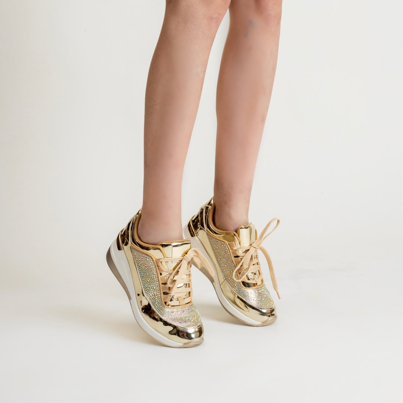 The Twinkle Kick Sneakers shine in gold and silver with rhinestone accents. With low height heel, it offers another extra inch of height with the hidden heel given the extra padding and cushion. Perfect for weddings, sangeets, and festive parties, they’re a chic swap for heels. Dance in comfort while keeping your look bold and glamorous. Call it the statement of your outfit or after party shoes, the high quality shine make your style a statement.