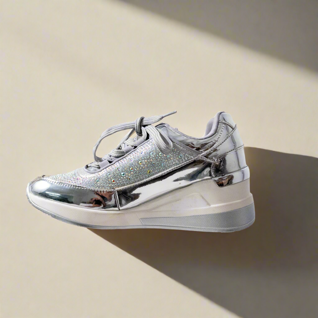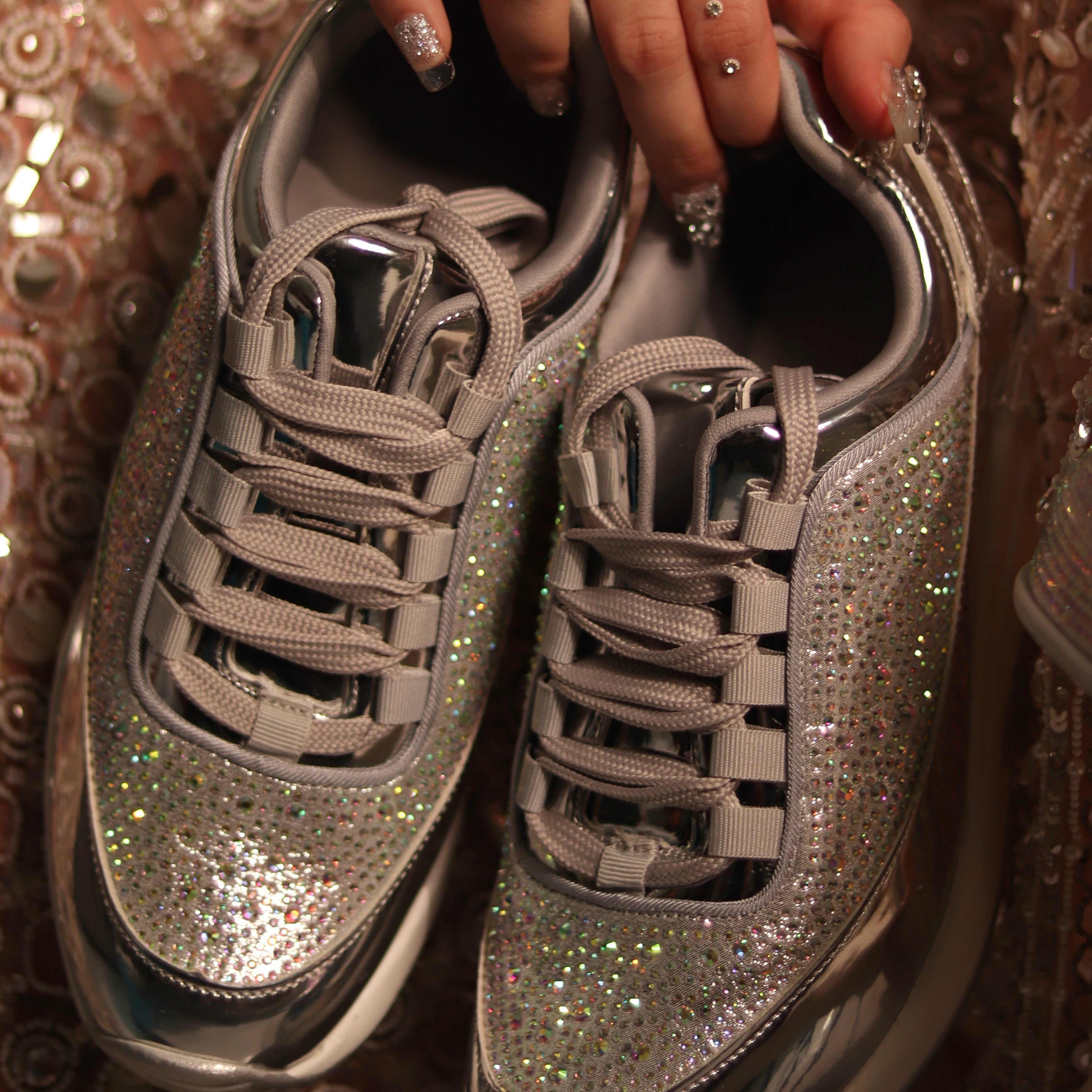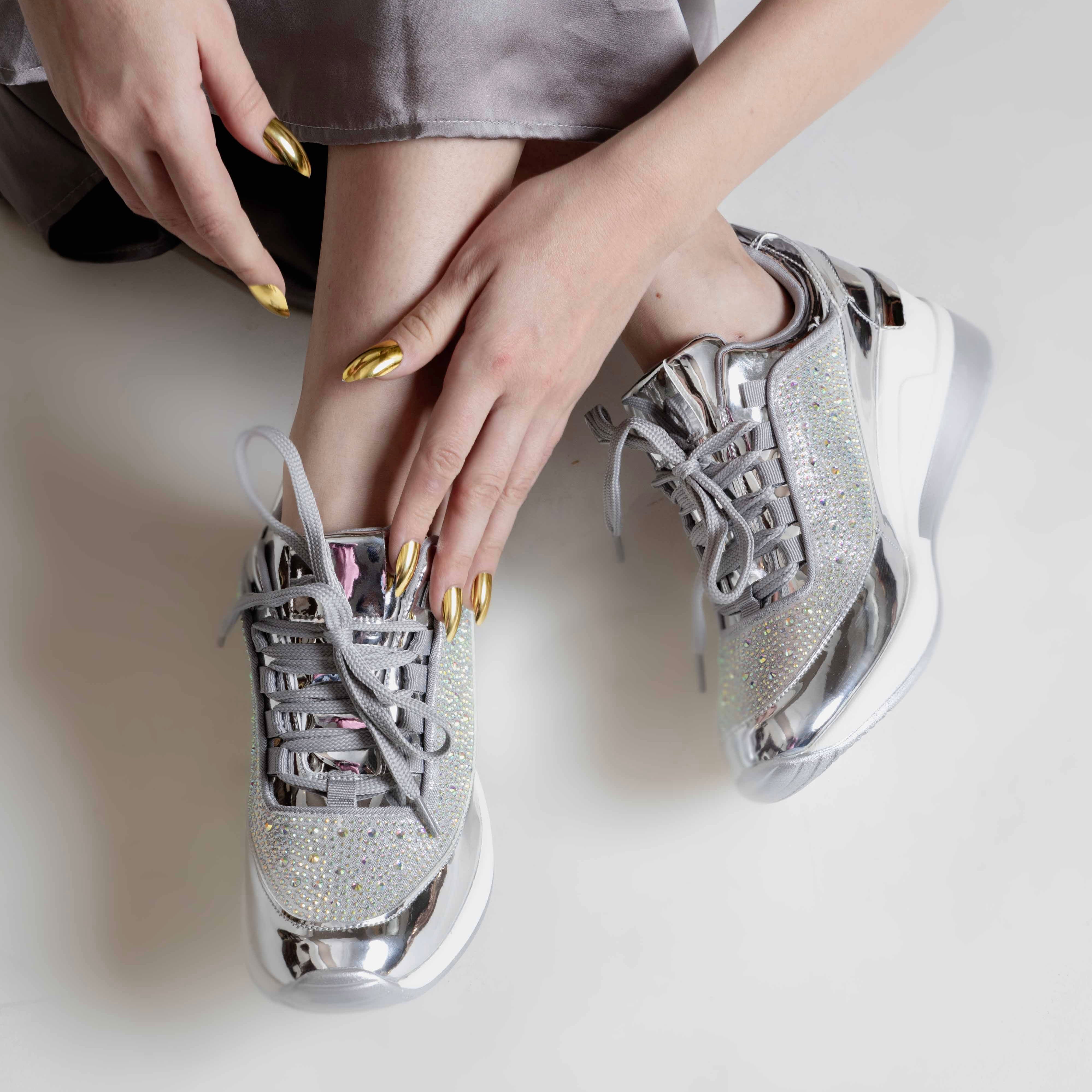 The Twinkle Kick Sneakers shine in gold and silver with rhinestone accents. With low height heel, it offers another extra inch of height with the hidden heel given the extra padding and cushion. Perfect for weddings, sangeets, and festive parties, they’re a chic swap for heels. Dance in comfort while keeping your look bold and glamorous. Call it the statement of your outfit or after party shoes, the high quality shine make your style a statement.